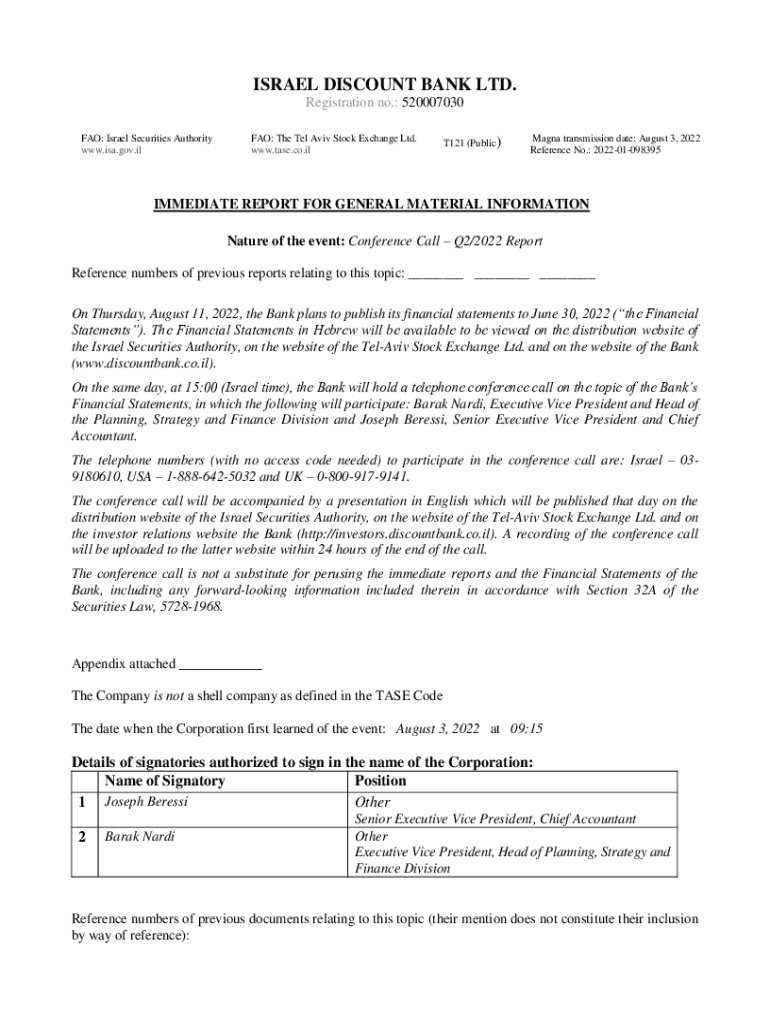 ISRAEL DISCOUNT BANK LTD. Registration no.: 520007030 FAO: Israel Securities Authority www.isa.gov.ilFAO: The Tel Aviv Stock Exchange Ltd. www.tase.co.ilT121 (Public)Magma transmission date: August