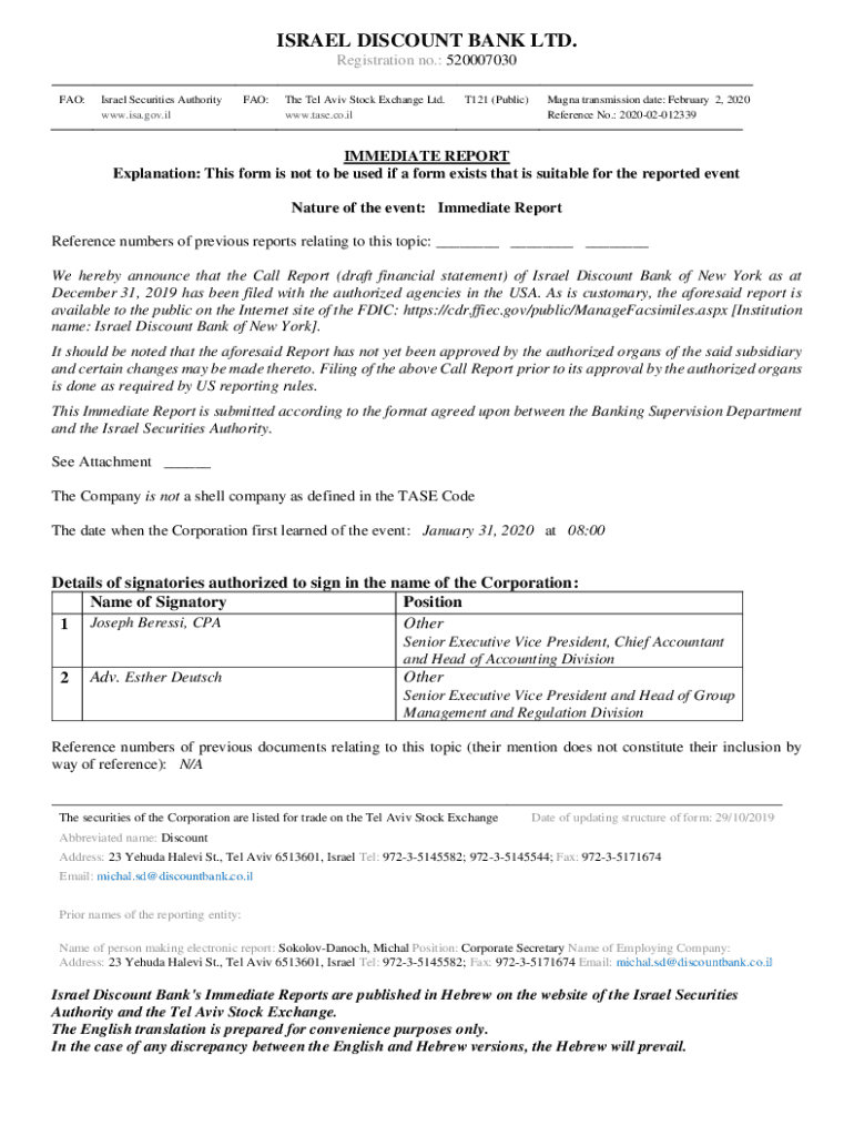 Get the free We hereby announce that the Call Report (draft financial statement) of Israel Discou...