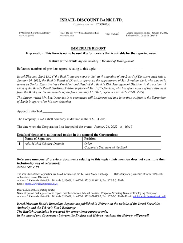 ISRAEL DISCOUNT BANK LTD. Registration no.: 520007030 FAO: Israel Securities Authority www.isa.gov.ilFAO: The Tel Aviv Stock Exchange Ltd. www.tase.co.ilT121 (Public)Magma transmission date: January
