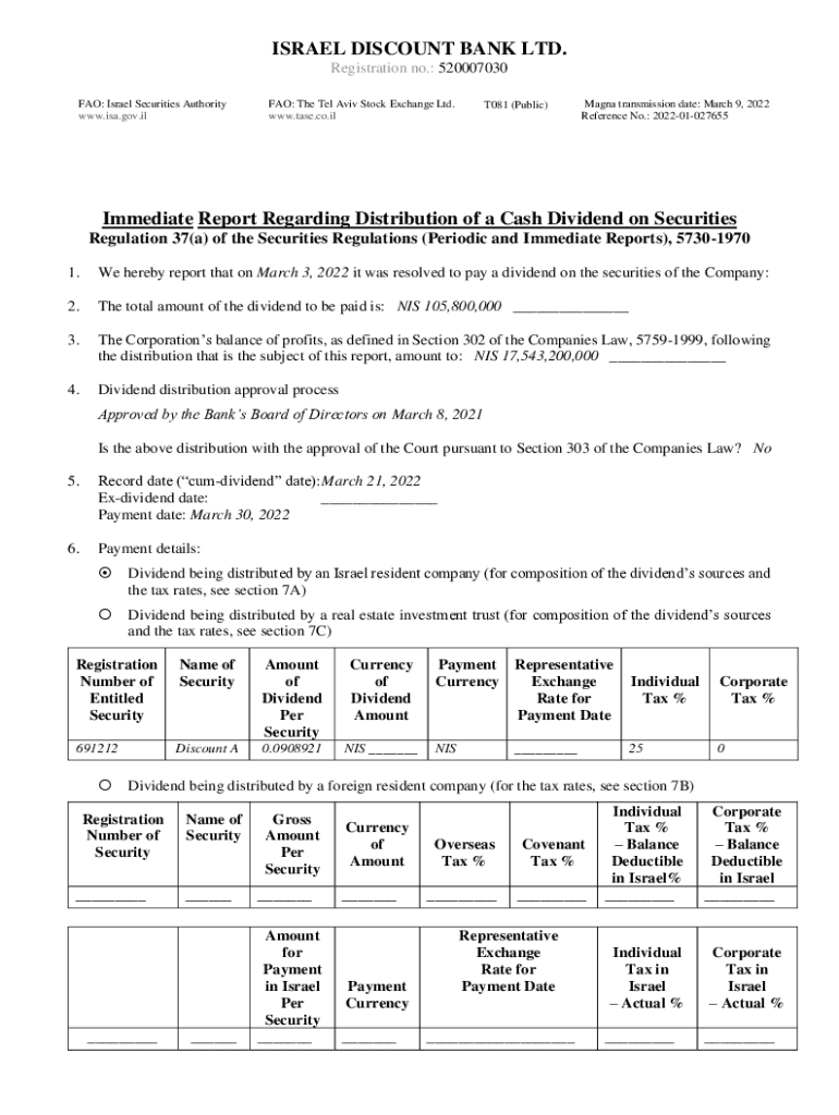 Get the free Immediate Report Regarding Distribution of a Cash Dividend on Securities