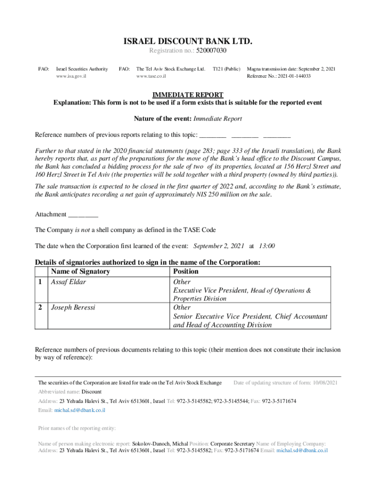 ISRAEL DISCOUNT BANK LTD. Registration no.: 520007030 FAO:Israel Securities Authority www.isa.gov.ilFAO:The Tel Aviv Stock Exchange Ltd. www.tase.co.ilT121 (Public)Magma transmission date: September