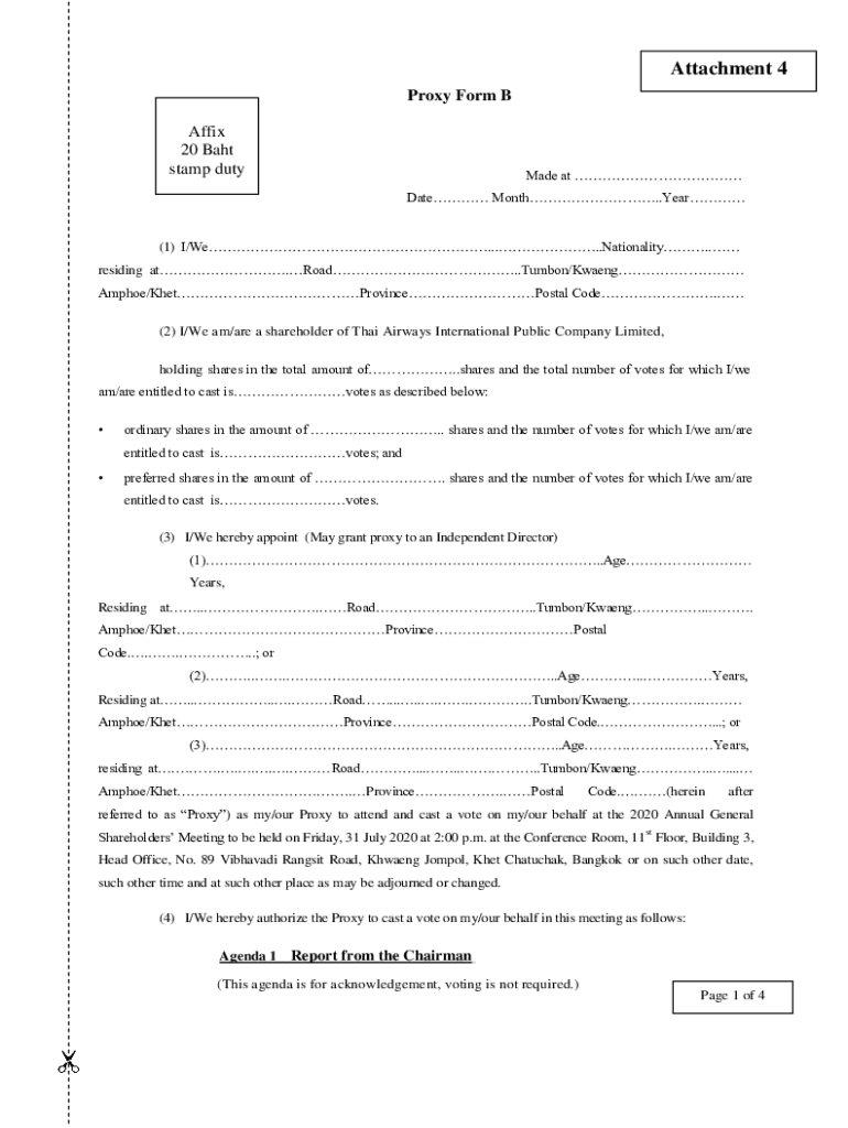 Attachment 4 Proxy Form B Affix 20 Baht stamp DataMade at Date Month. Year(1) I/We..... Nationality. Residing at. Road. Tumor/Wang Amp hoe/KhetProvincePostal Code.