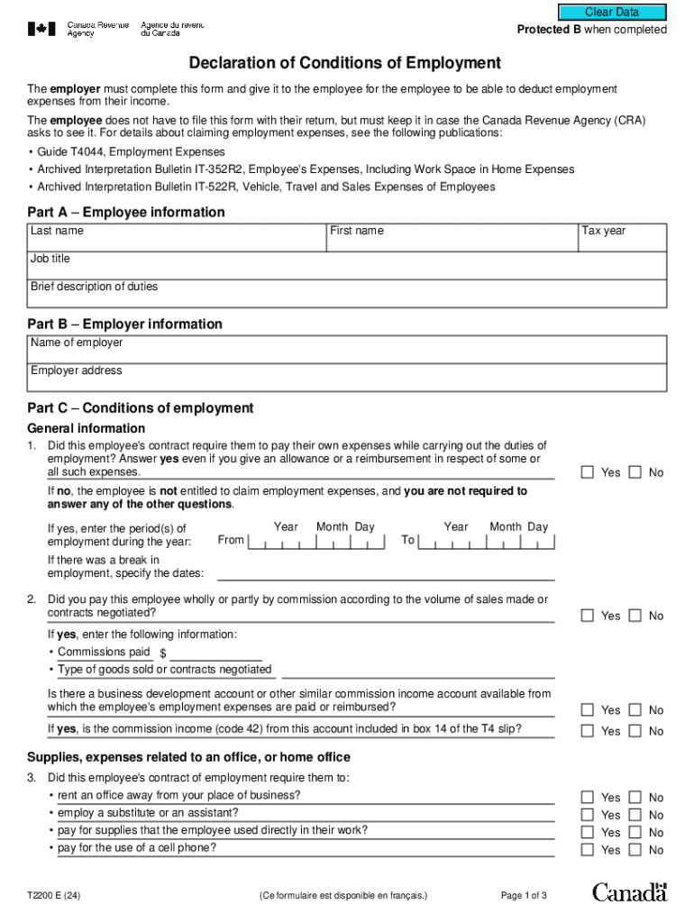 Employees who incur expenses as a condition of their employment and wish to claim tax deductions for those expenses must have their employer fill out and sign the T2200 form.