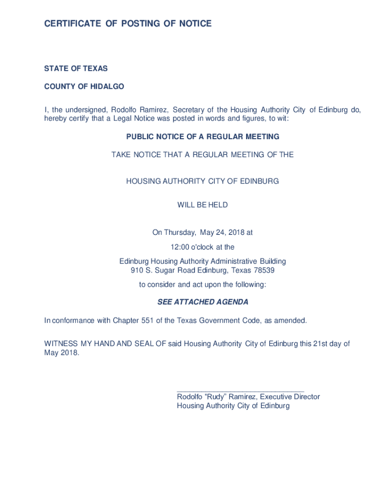 CERTIFICATE OF POSTING OF NOTICESTATE OF TEXAS COUNTY OF HIDALGO I, the undersigned, Rodolfo Ramirez, Secretary of the Housing Authority City of Edinburg do, hereby certify that a Legal Notice was