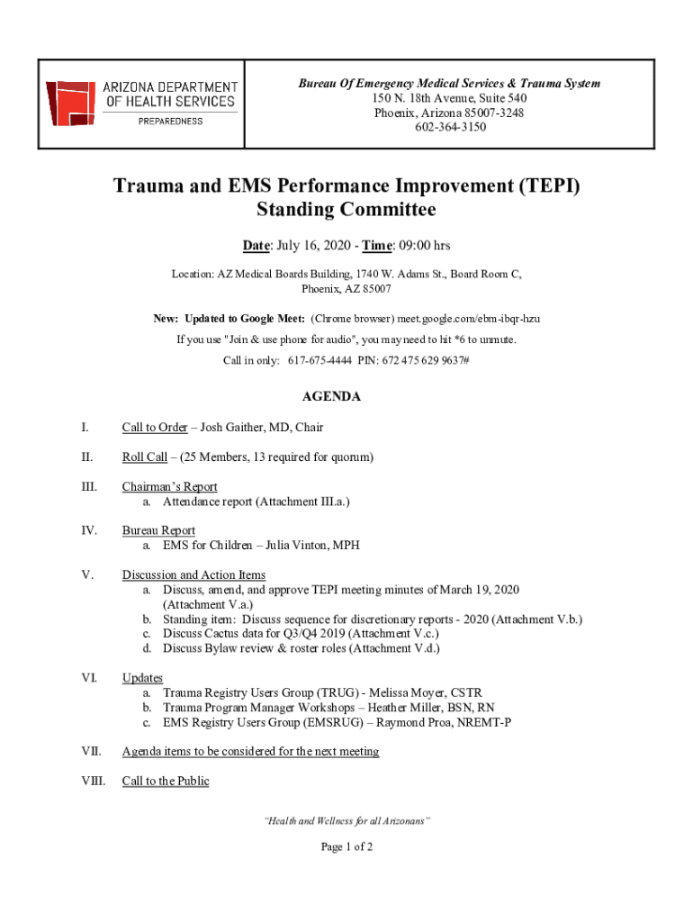 Bureau Of Emergency Medical Services & Trauma System 150 N. 18th Avenue, Suite 540 Phoenix, Arizona 850073248 6023643150Trauma and EMS Performance Improvement (TERI) Standing Committee Date: July