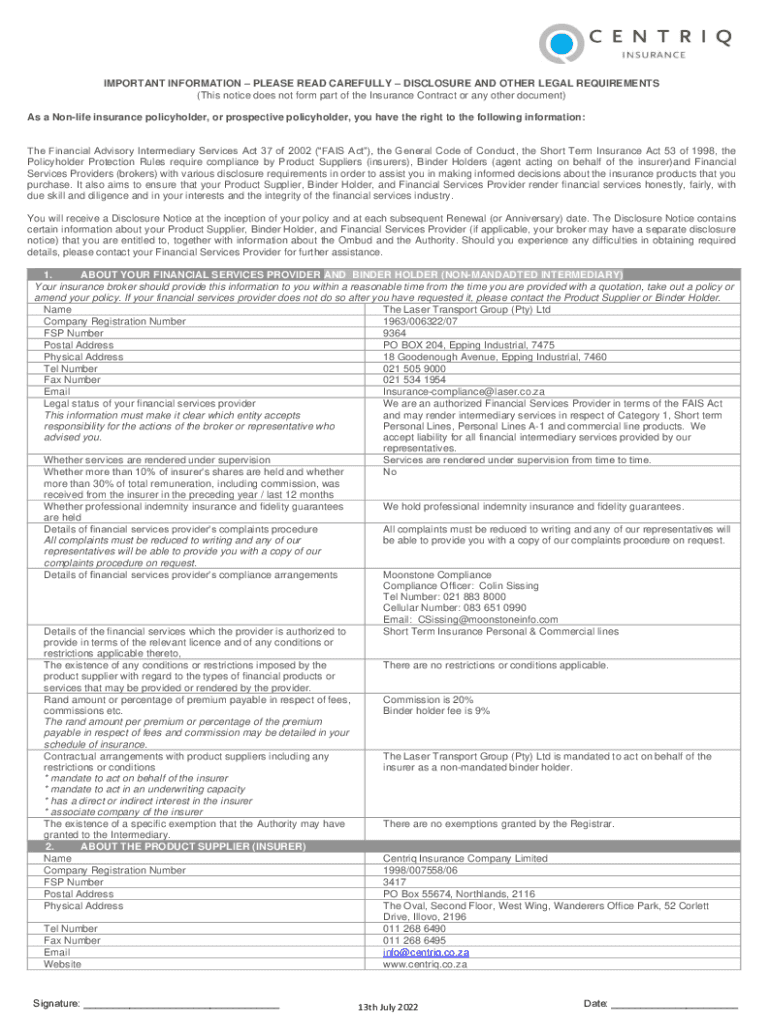 IMPORTANT INFORMATION PLEASE READ CAREFULLY DISCLOSURE AND OTHER LEGAL REQUIREMENTS (This notice does not form part of the Insurance Contract or any other document) As a Nonlife insurance policyholder,