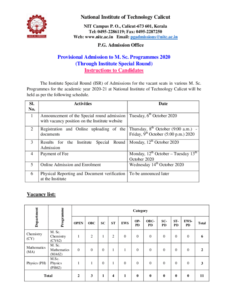National Institute of Technology Cali cut NIT Campus P. O., Calicut673 601, Kerala Tel: 04952286119; Fax: 04952287250 Web: www.nitc.ac.in Email: pgadmissions@nitc.ac.inP. G. Admission OfficeProvisional