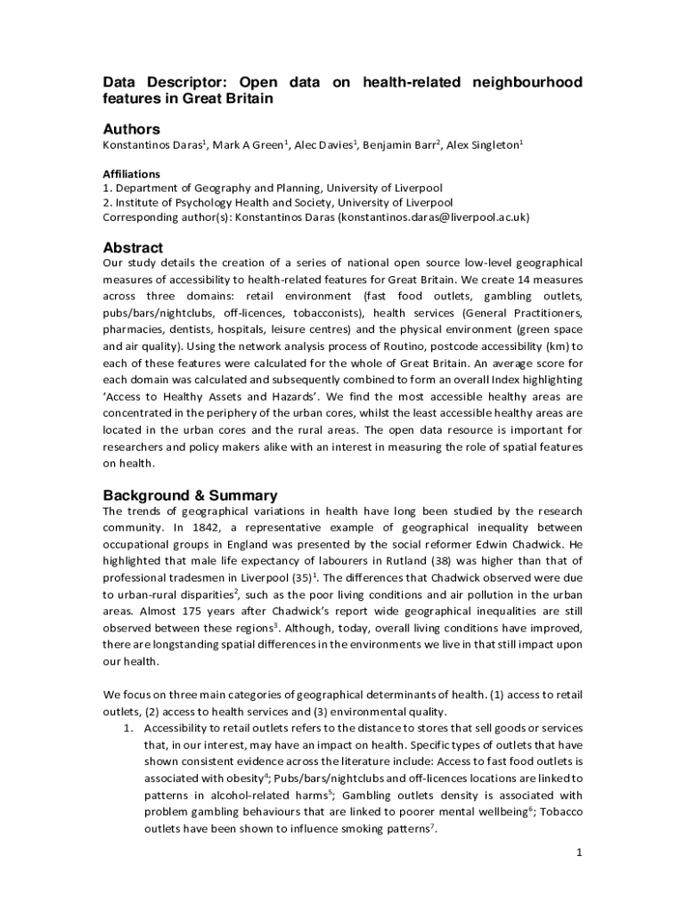 Data Descriptor: Open data on health related neighborhood features in Great Britain Authors Konstantinos Daras1, Mark A Green1, Alec Davies1, Benjamin Barr2, Alex Singleton1 Affiliations 1. Department