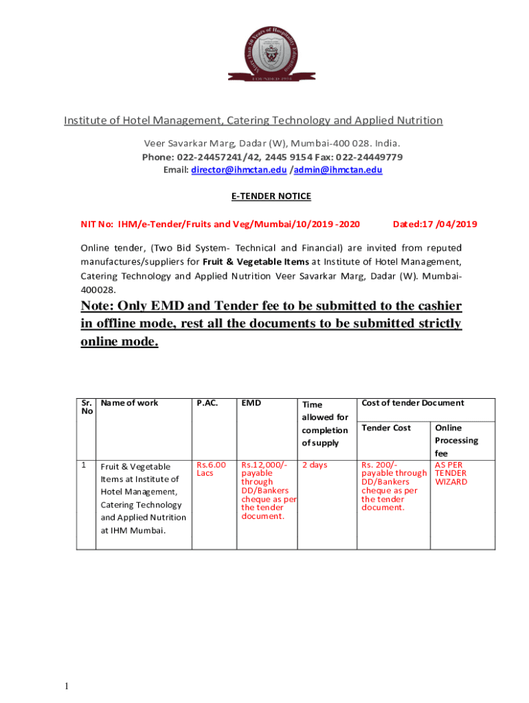 Get the free Note: Only EMD and Tender fee to be submitted to the cashier ...