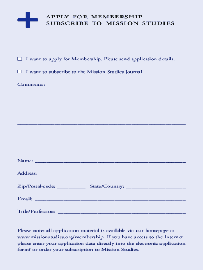 I want to apply for Membership. Please send application details. I want to subscribe to the Mission Studies Journal Comments: ___ ___ ___ ___ ___ ___ Name: ___ Address: ___ Zip/Postal code: ___ State/Country: