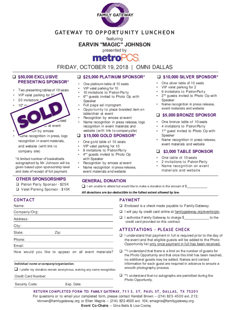 G AT E WAY TO O P P O RT U N I T Y L U N C H E O N featuringEARVIN \” MAGIC\” JOHNSON presented Friday, OCTOBER 19, 2018 | OFNI DALLAS $50,000 EXCLUSIVE PRESENTING SPONSOR* Two presenting tables