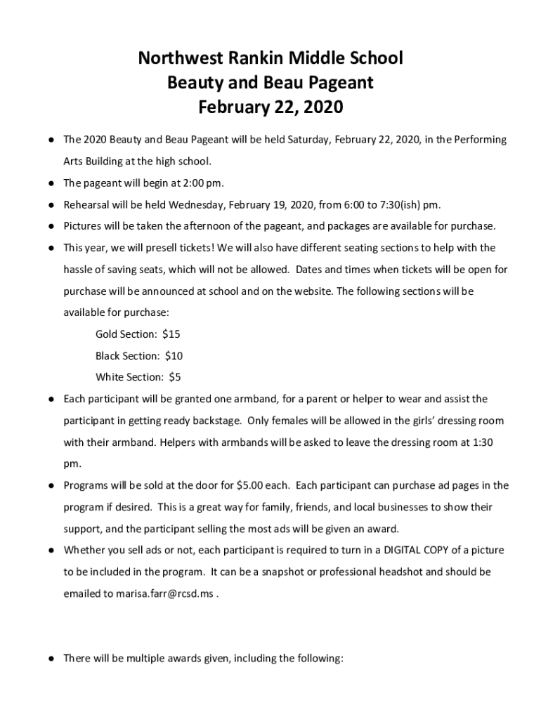 Northwest Rankin Middle School Beauty and Beau Pageant February 22, 2020, The 2020 Beauty and Beau Pageant will be held Saturday, February 22, 2020, in the Performing Arts Building at the high school.