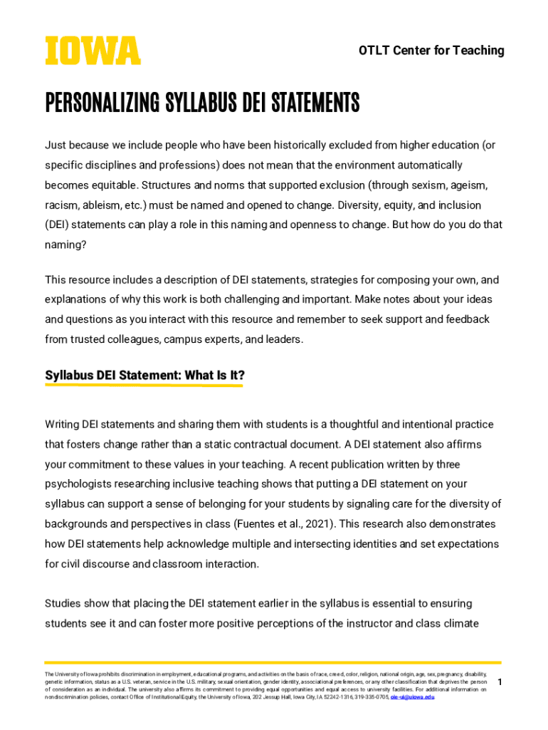 OLT Center for TeachingPERSONALIZING SYLLABUS DEI STATEMENTS Just because we include people who have been historically excluded from higher education (or specific disciplines and professions) does