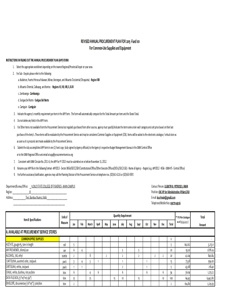 REVISED ANNUAL PROCUREMENT PLAN FOR 2015 Fund 101