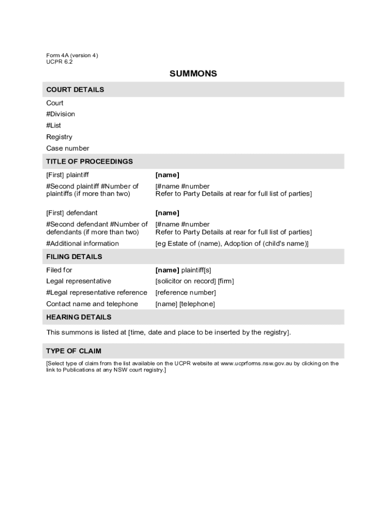 Form 4A (version 4) CPR 6.2SUMMONS COURT DETAILS Court #Division #List Registry Case number TITLE OF PROCEEDINGS [First] plaintiff[name]#Second plaintiff #Number of plaintiffs (if more than two)[#name