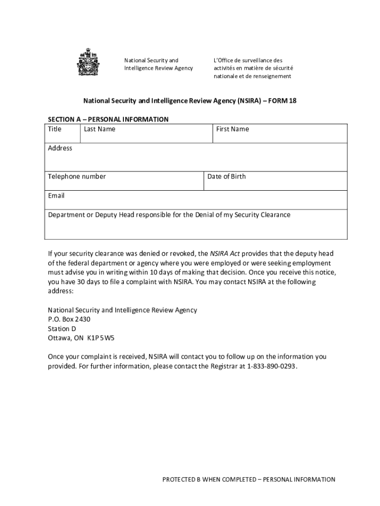National Security and Intelligence Review AgencyLOffice de surveillance DES activity en mature DE security national et de renseignementNational Security and Intelligence Review Agency (NS IRA) FORM