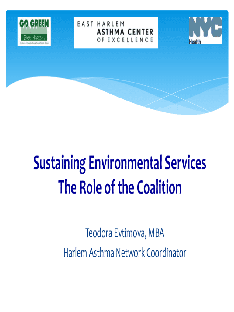 Sustaining Environmental Services Role of the CoalitionTeodora Evtimova, MBA Harlem Asthma Network CoordinatorAsthma in HarlemSource: NYC EPHE, 2009 March 20122Factors Contributing to Disparities