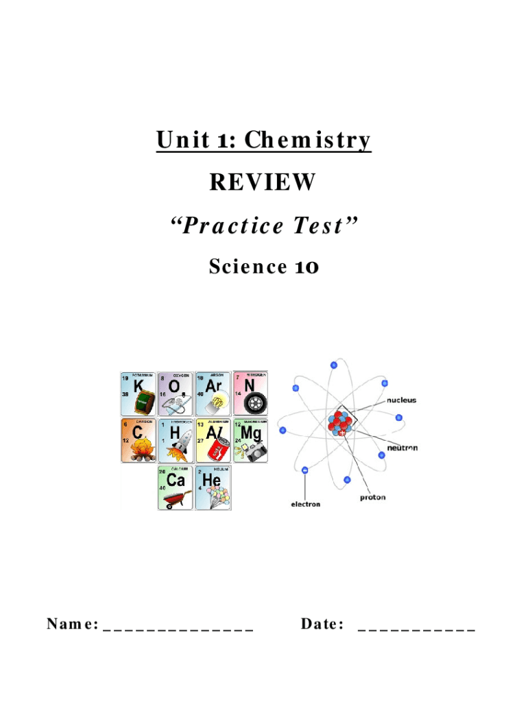 Unit 1: Chemistry REVIEW Practice Test Science 10Name: ___Date: ___PART 1: Atomic Structure & Bonding Vocabulary: Referring to your notes, define each of the following vocabulary terms in a complete