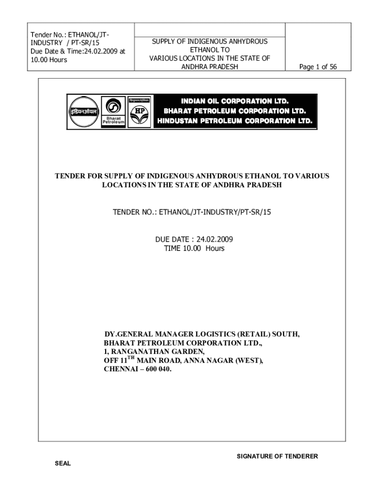 Tender No.: ETHANOL/INDUSTRY / PSR/15 Due Date & Time:24.02.2009 at 10.00 HoursSUPPLY OF INDIGENOUS ANHYDROUS ETHANOL TO VARIOUS LOCATIONS IN THE STATE OF ANDHRA PRADESHPage 1 of 56TENDER FOR SUPPLY