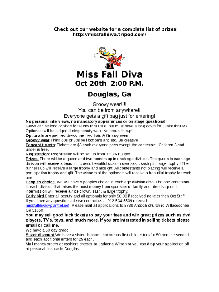 The registration - Miss Fall Diva Pageant is a Word document that has to be filled-out and signed for specified purpose. Then, it is furnished to the actual addressee in order to provide certain info and data. The completion and signing can be done manually or with a suitable application e. g. PDFfiller. These tools help to fill out any PDF or Word file without printing out. It also allows you to edit it according to your requirements and put an official legal e-signature. Once finished, the user sends the registration - Miss Fall Diva Pageant to the respective recipient or several recipients by mail or fax. PDFfiller includes a feature and options that make your template printable. It offers various options when printing out appearance. No matter, how you'll deliver a form after filling it out - physically or by email - it will always look neat and organized. To not to create a new writable document from the beginning over and over, turn the original Word file as a template. After that, you will have a customizable sample.