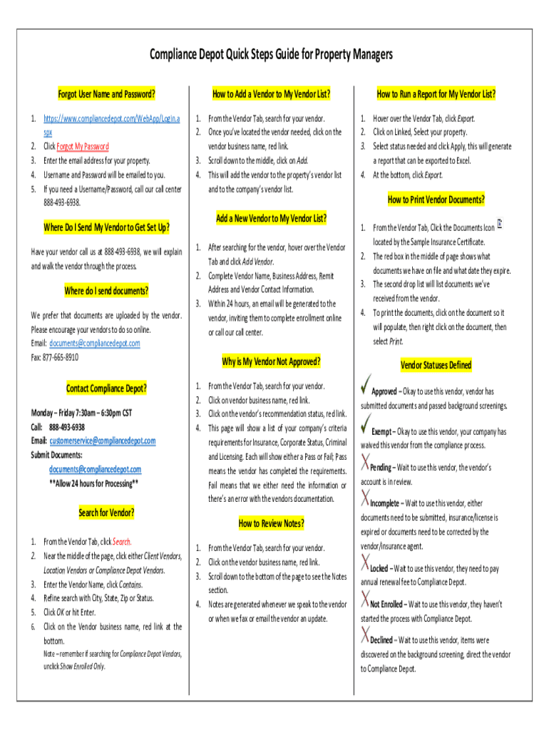 Compliance Depot Quick Steps is a process for vendors to provide required documentation and information to demonstrate compliance with property management companies.