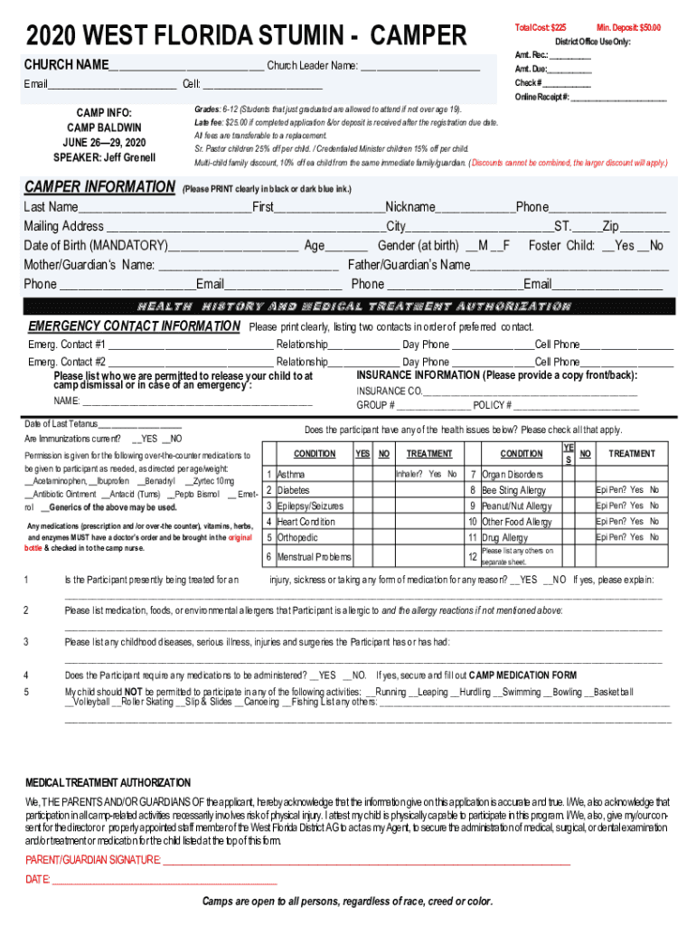 2020 WEST FLORIDA STUDIO CAMPERTotal Cost: $225 Min. Deposit: $50.00 District Office Use Only: Amt. Rec.: ___ Amt. Due:___ Check # ___ Online Receipt #: ___CHURCH NAME___ Church Leader Name: ___ Email___