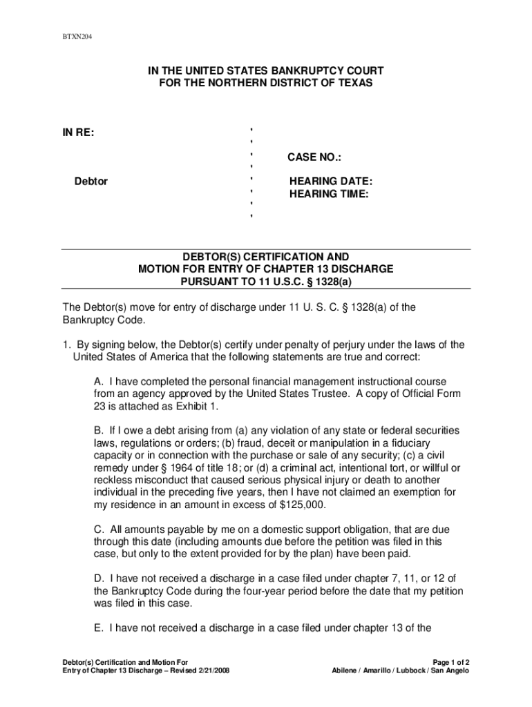 BTXN204IN THE UNITED STATES BANKRUPTCY COURT FOR THE NORTHERN DISTRICT OF TEXAS RE:\' \' \' \' \' \' \' \'Debtor CASE NO.: HEARING DATE: HEARING TIME:DEBTOR(S) CERTIFICATION AND MOTION FOR ENTRY OF