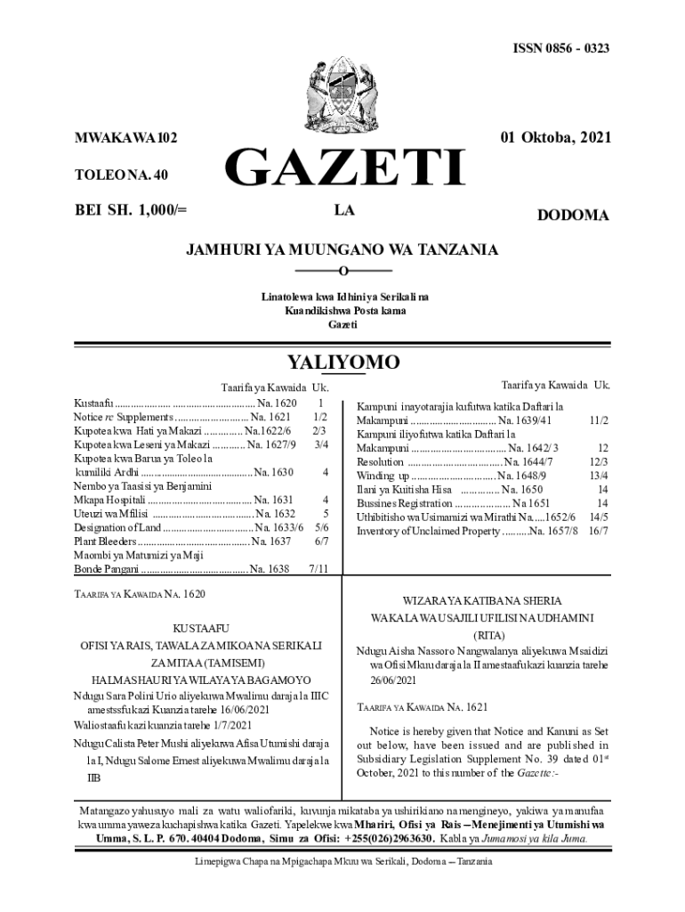 ISSN 0856 0323MWAKA WA 102GAZETITOLEO NA. 40BEI SH. 1,000/LA01 OKTA, 2021DODOMAJAMHURI YA MUNDANE WA TANZANIA