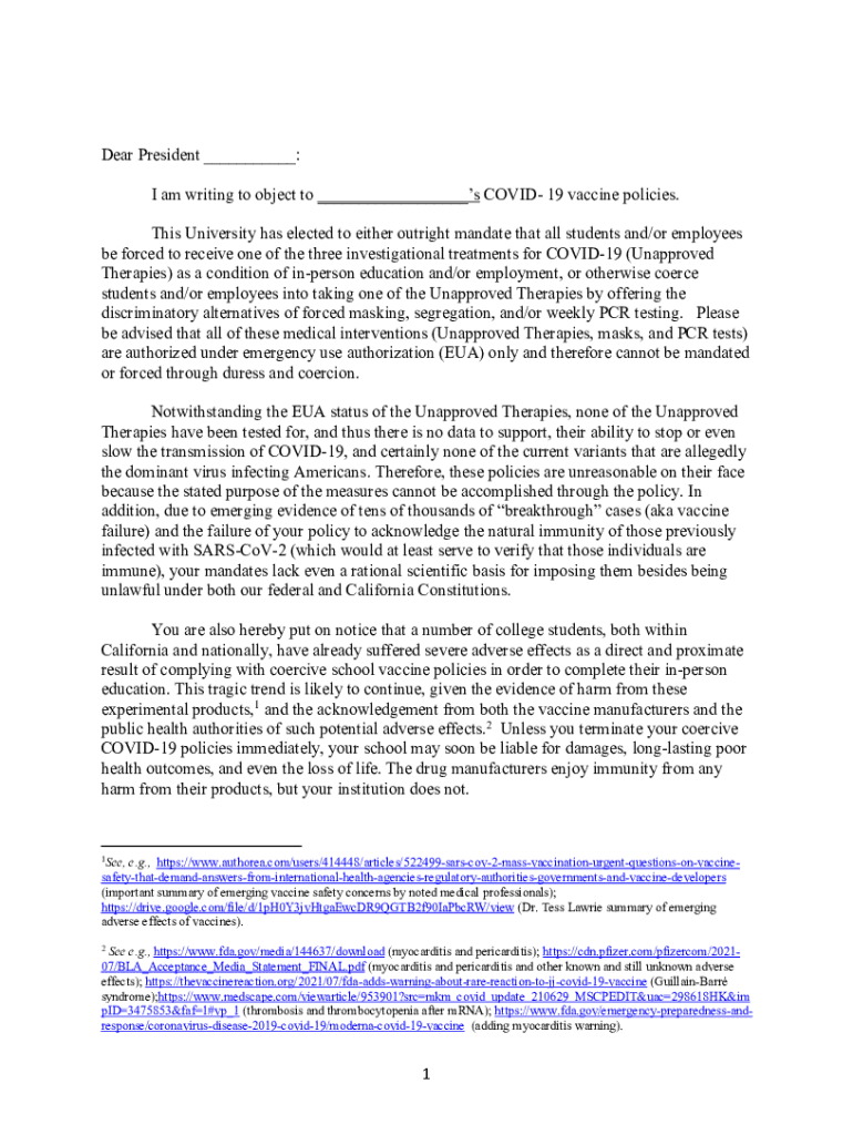 Dear President ___: I am writing to object to ___s COVID-19 vaccine policies. This University has elected to either outright mandate that all students and/or employees be forced to receive one of