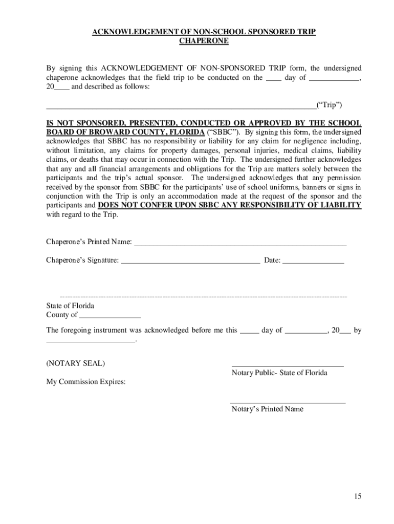 ACKNOWLEDGEMENT OF SCHOOL SPONSORED TRIP Chaperoned signing this ACKNOWLEDGEMENT OF COSPONSORED TRIP form, the undersigned chaperone acknowledges that the field trip to be conducted on the ___ day