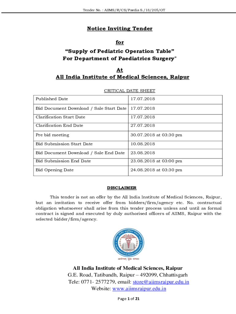 Tender No. AIMS/R/CS/Media S./18/205/Notice Inviting Tender for Supply of Pediatric Operation Table For Department of Pediatrics Surgery\” At All India Institute of Medical Sciences, Raipur CRITICAL