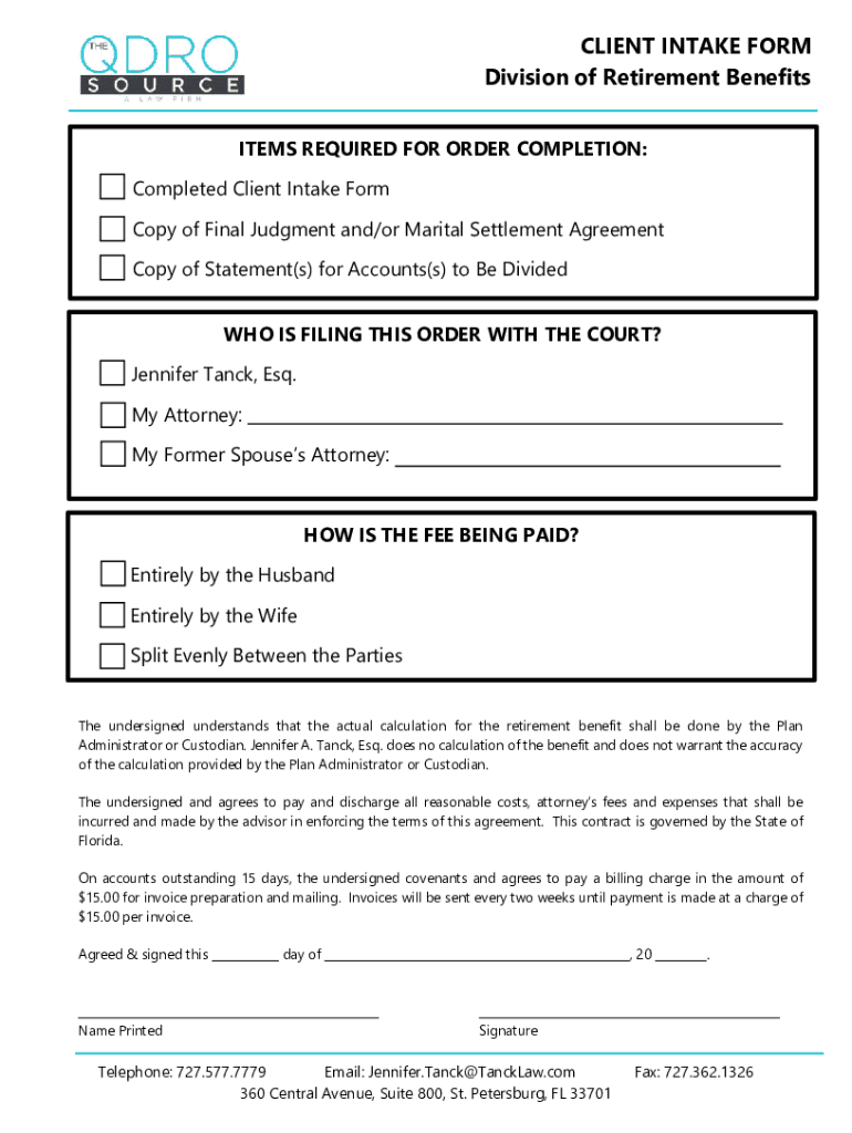 CLIENT INTAKE FORM Division of Retirement Benefits ITEMS REQUIRED FOR ORDER COMPLETION: Completed Client Intake Form Copy of Final Judgment and/or Marital Settlement Agreement Copy of Statement(s)