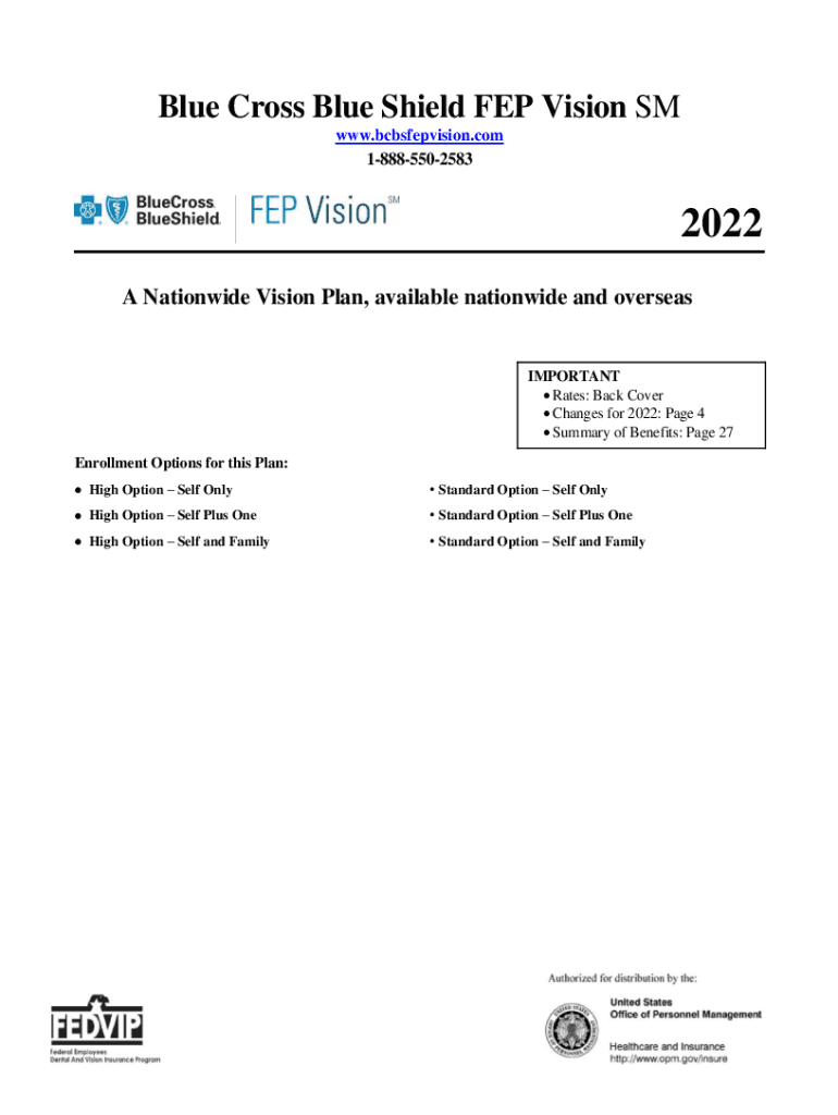 Blue Cross Blue Shield FEP Vision SM www.bcbsfepvision.com 188855025832022 A Nationwide Vision Plan, available nationwide and overseasIMPORTANT Rates: Back Cover Changes for 2022: Page 4 Summary of