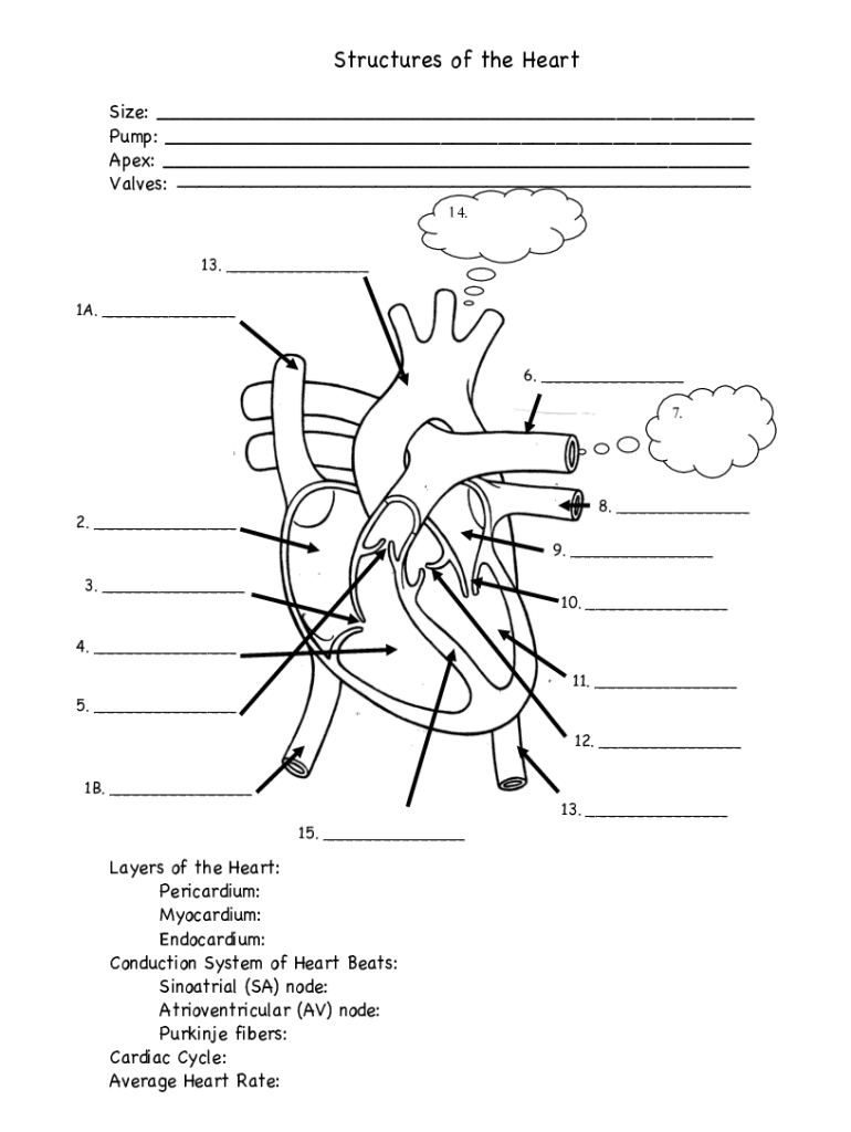 Name ___ Date ___ Period ___Structures of the Heart Blood FlowArteries: ___ Size: ___ Pump: ___ Veins: ___ Apex: ___ Capillaries: Valves: ___ 14.13. ___1A. ___Color & Label the HEART6. ___ 7.8. ___2.