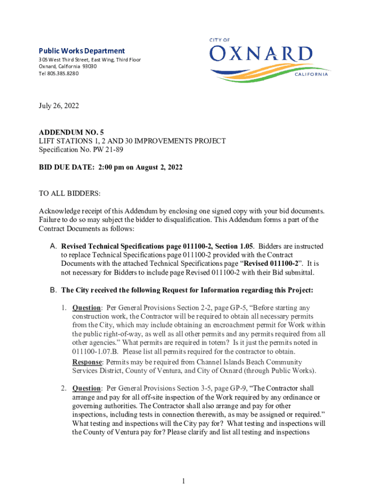 PublicWorksDepartment 305WestThirdStreet,Eating, ThirdFloor Oxnard,California93030 Tel805.385.8280 July 26, 2022, ADDENDUM NO. 5 LIFT STATIONS 1, 2 AND 30 IMPROVEMENTS PROJECT Specification No. PW