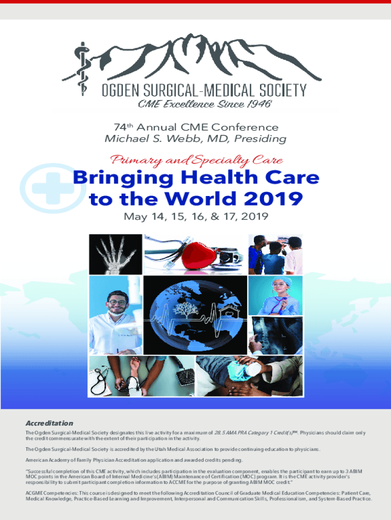 74th Annual CME Conference Michael S. Webb, MD, PresidingPrimary and Specialty Rearranging Health Care to the World 2019 May 14, 15, 16, & 17, 2019 Accreditation Ogden SurgicalMedical Society designates