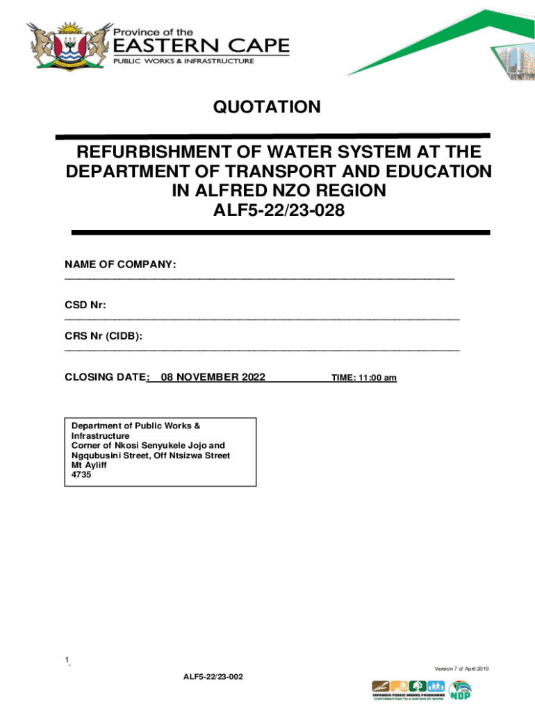 QUOTATION REFURBISHMENT OF WATER SYSTEM AT THE DEPARTMENT OF TRANSPORT AND EDUCATION IN ALFRED NO REGION ALF522/23028 NAME OF COMPANY: ___CSD NR: ___CRS NR (CDB): ___CLOSING DATE:08 NOVEMBER 2022TIME:
