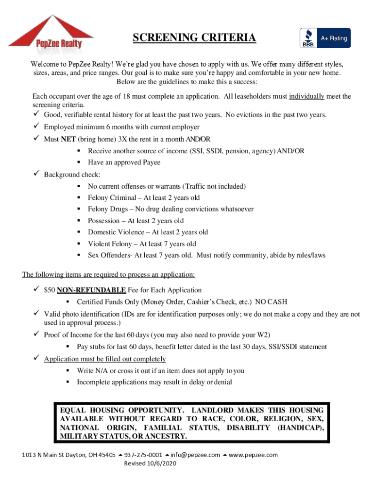 SCREENING CRITERIA Welcome to Pepper Realty! Were glad you have chosen to apply with us. We offer many styles, sizes, areas, and price ranges. Our goal is to make sure you're happy and comfortable