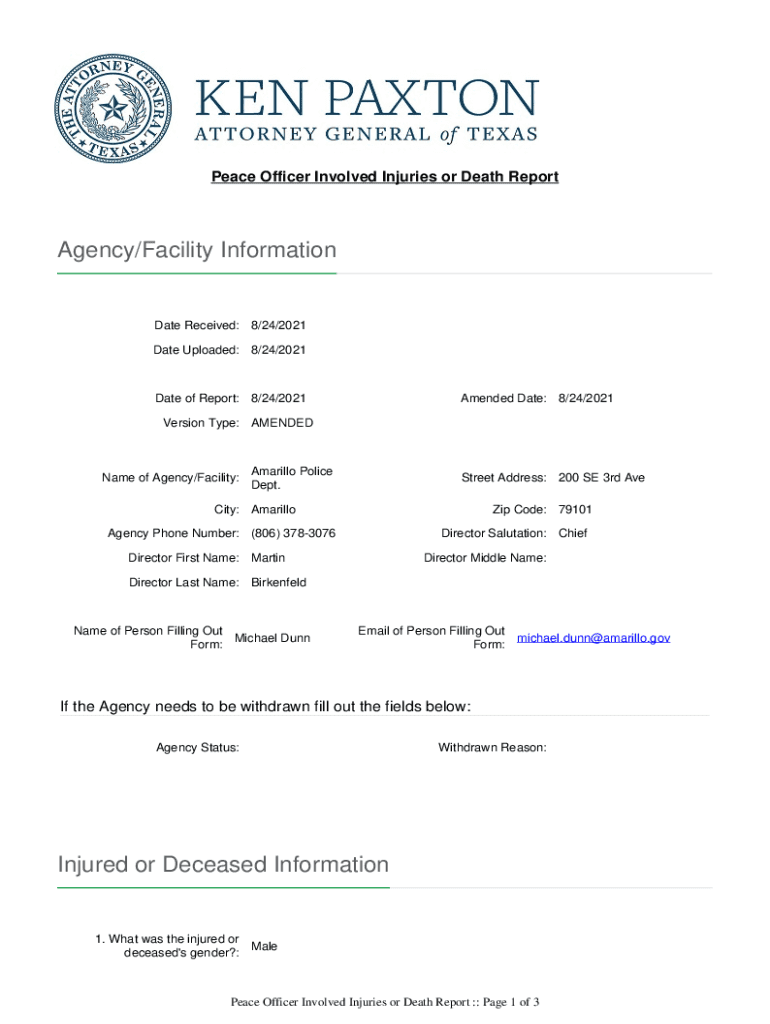 Date Uploaded: 8/24/2021Date of Report: 8/24/2021Amended Date: 8/24/2021Version Type: AMENDEDName of Agency/Facility:Amarillo