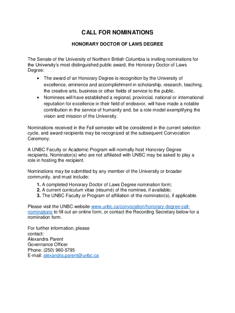 CALL FOR NOMINATIONS HONORARY DOCTOR OF LAWS DEGREE The Senate of the University of Northern British Columbia is inviting nominations for the Universities most distinguished public award, the Honorary