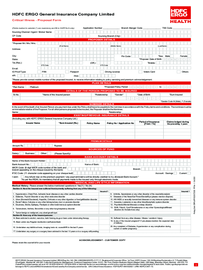 HDFC ERGO General Insurance Company Limited Critical Illness Proposal Form Application Number ___ Branch manager Code ___ TSE Code ___(Fields marked in asterisk (*) are mandatory and fill in CAPITALS