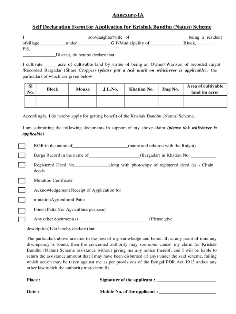Get the free Annexure-IA Self Declaration Form for Application for Krishak ...