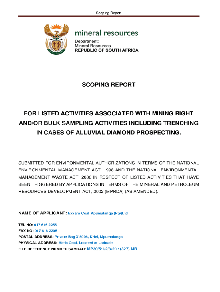 Scoping ReportSCOPING REPORTER LISTED ACTIVITIES ASSOCIATED WITH MINING RIGHT AND/OR BULK SAMPLING ACTIVITIES INCLUDING TRENCHING IN CASES OF ALLUVIAL DIAMOND PROSPECTING.SUBMITTED FOR ENVIRONMENTAL