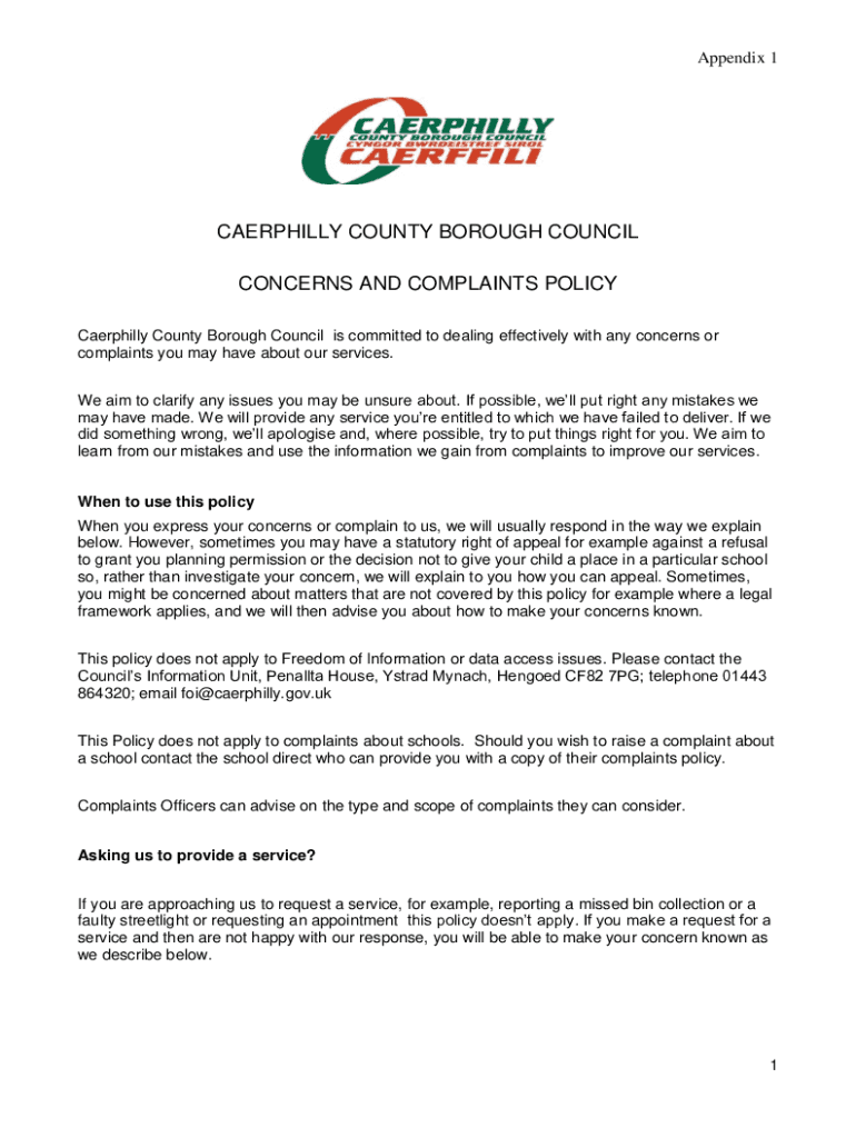 Appendix 1CAERPHILLY COUNTY BOROUGH COUNCIL CONCERNS AND COMPLAINTS POLICY Caerphilly County Borough Council is committed to dealing effectively with any concerns or complaints you may have about