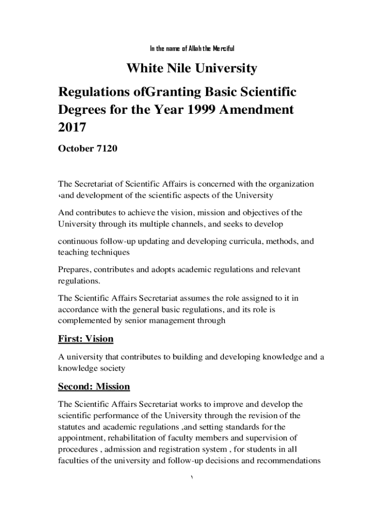 In the name of Allah the Merciful White Nile University Regulations granting Basic Scientific Degrees for the Year 1999 Amendment 2017 October 7120The Secretariat of Scientific Affairs is concerned