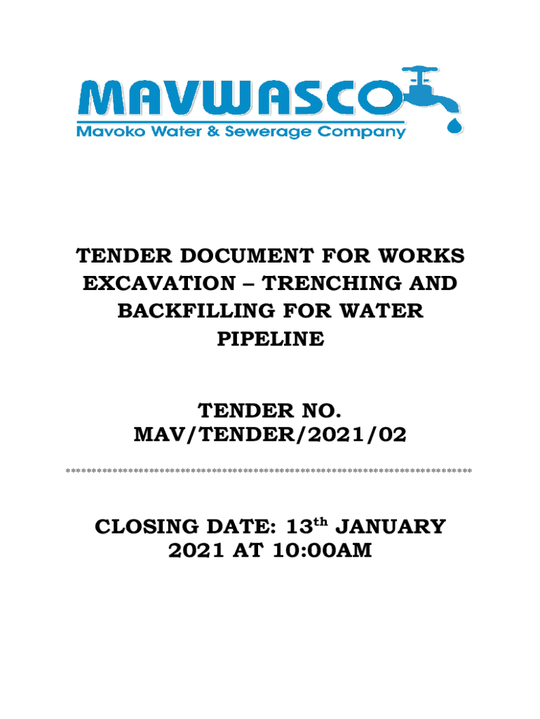 TENDER DOCUMENT FOR WORKS EXCAVATION TRENCHING AND BACKFILLING FOR WATER PIPELINETENDER NO. MAV/TENDER/2021/02 ******************************************************************************CLOSING