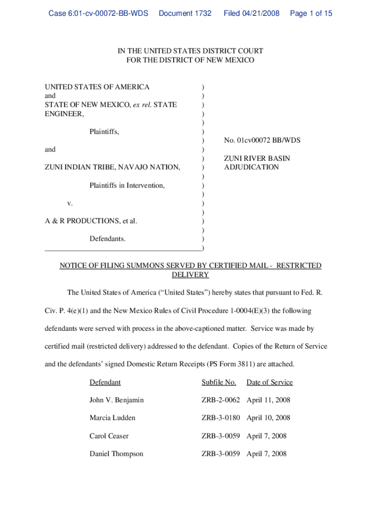 Case 6:01cv00072BBWDSDocument 1732Filed 04/21/2008Page 1 of 15IN THE UNITED STATES DISTRICT COURT FOR THE DISTRICT OF NEW MEXICOUNITED STATES OF AMERICA and STATE OF NEW MEXICO, ex rel. STATE ENGINEER,)