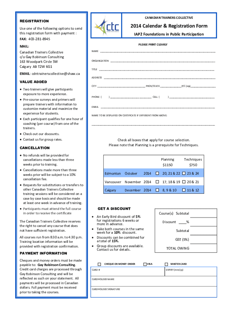CANADIAN TRAINERS COLLECTIVEREGISTRATION2014 Calendar & Registration Forms one of the following options to send this registration form with payment :IAP2 Foundations in Public Participation FAX: 4032818945