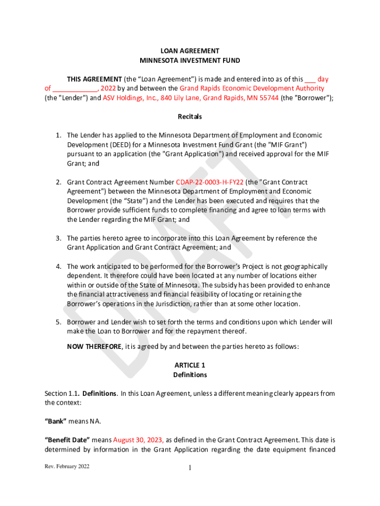 LOAN AGREEMENT MINNESOTA INVESTMENT FUND THIS AGREEMENT (the Loan Agreement) is made and entered into as of this ___ day of ___, 2022 by and between the Grand Rapids Economic Development Authority