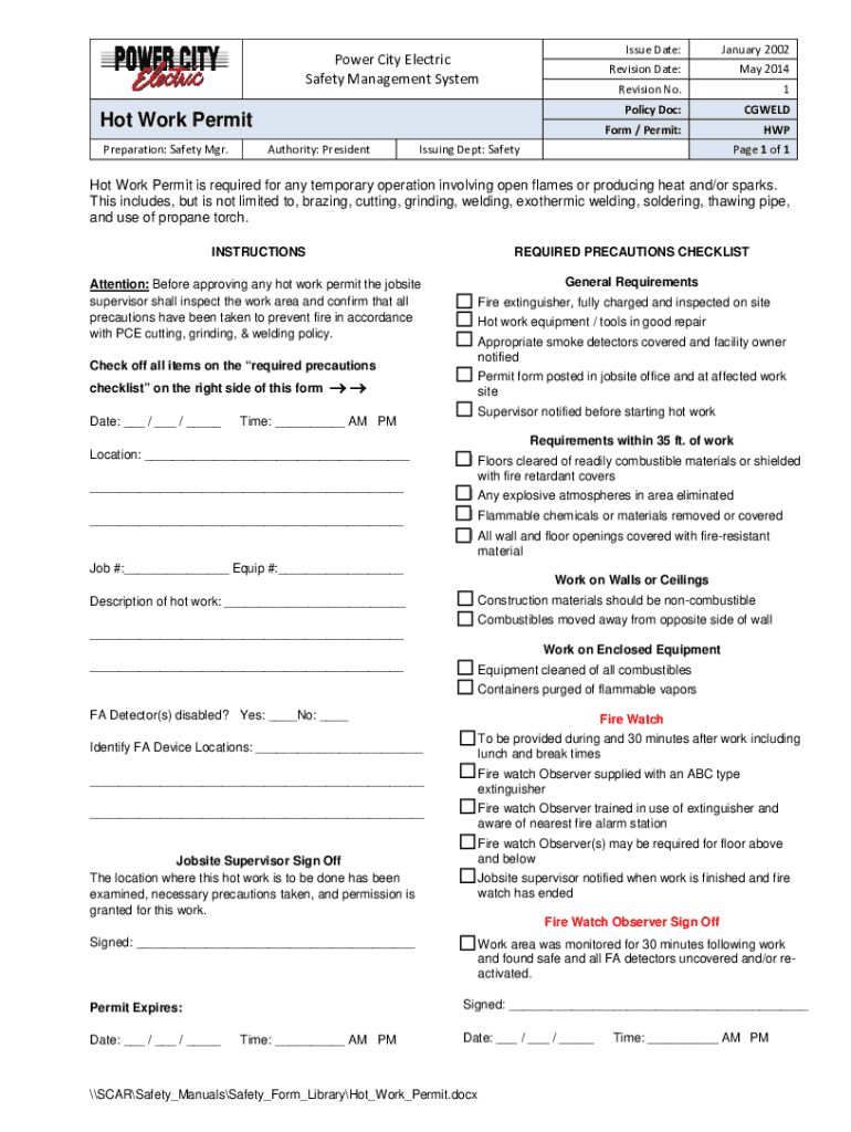 RESETSAVEPRINTPower City Electric Safety Management System Work Permit Preparation: Safety Mgr. EMAIL Issue Date:January 2002Revision Date:May 2014Revision No.1Policy Doc:CGWELDForm / Permit: Authority: